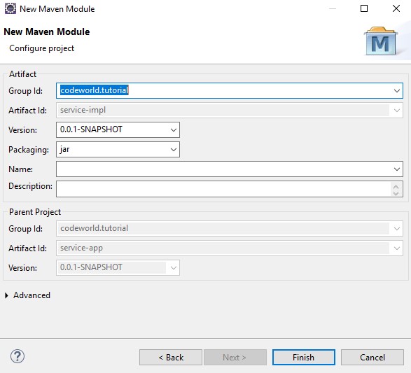 Follow the same steps of API maven module for creating the maven module for implementation.