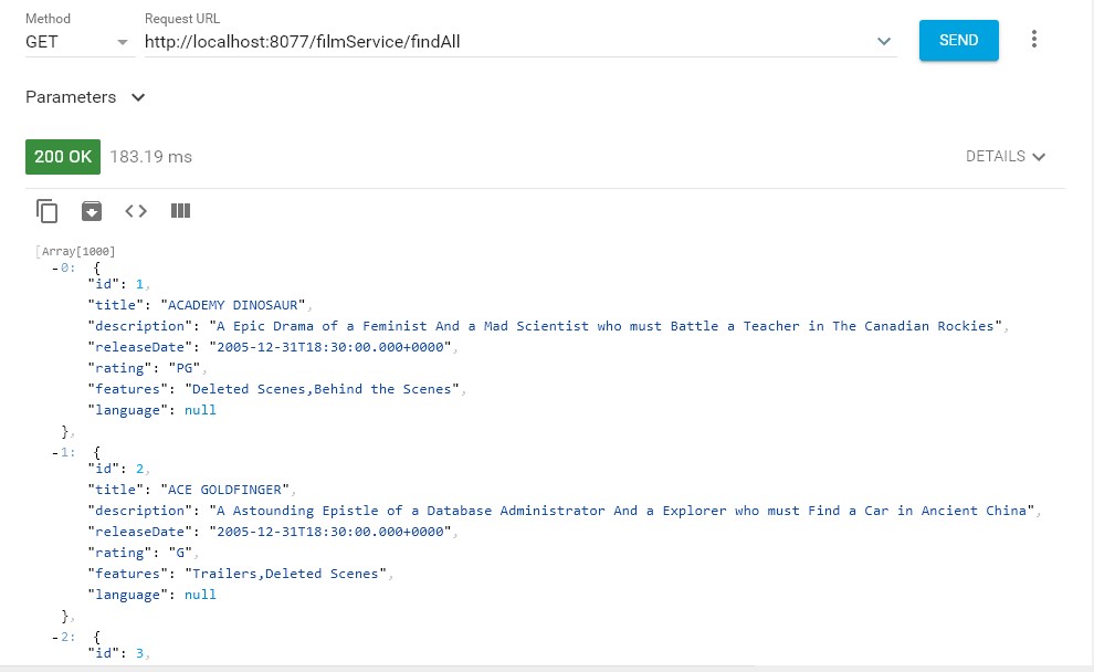 Let’s check this URL: http://localhost:8080/filmService/findAll
